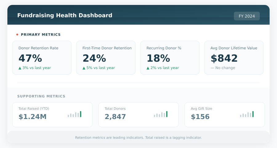 If you don't currently track donor retention, start there. Pull last year's donor list and this year's donor list. See how much overlap exists. That one number will tell you more about your fundraising health than total dollars raised ever could.